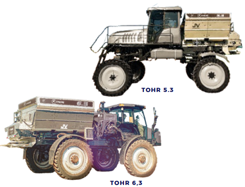Taxa variável, controlador Agres Isoview, Hexagon ou Iso Bus. Utiliza o sistema hidráulico do próprio autopropelido com adição de um trocador de calor (radiador de óleo). Caixas de transmissão com motores acoplados. Esteira de borracha autocentralizadora 900 mm. Rolos da esteira com rolamentos e retentores. Largura de distribuição: 14 a 16 metros para produtos em pó e até 36 metros para produtos granulados. Palheta do prato para produtos em pó côncava, evitando acúmulo de produto. Palheta do prato para produtos granulados com geometria diferenciada, com dois pontos de descarga insumos.